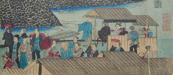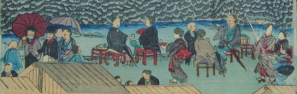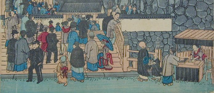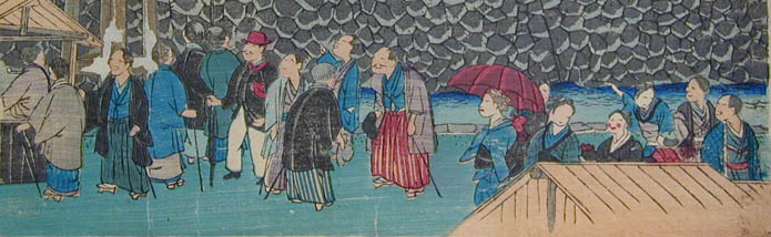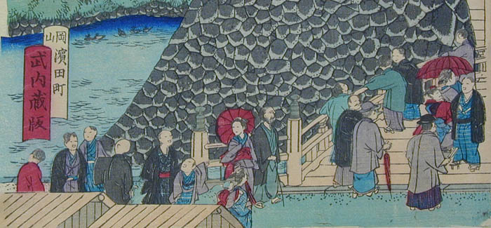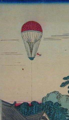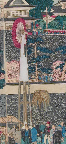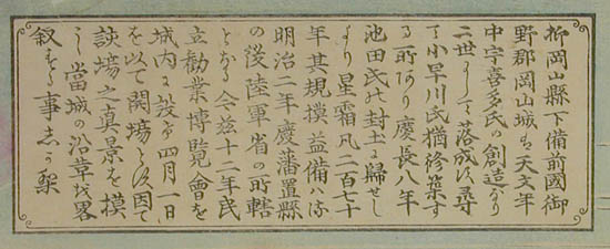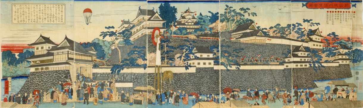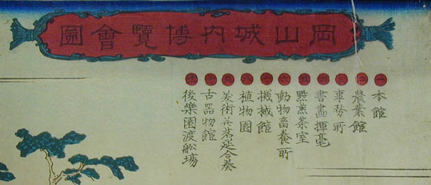 | 「これは何を描いた絵なの? お城の絵みたいだけど」という質問がありました。みなさんは、何の絵だと思いますか? この絵は「岡山城内博覧会図」といって、明治12年(1879)に岡山城を会場として開催された民立博覧会の錦絵です。ちょっと詳しくみてみましょう。 ≪時代背景≫ 明治政府は明治6年(1873)のウィーン万国博覧会参加の経験から殖産興業政策の一環として明治10年(1877)、東京上野公園で第1回内国勧業博覧会を開催しました。内国勧業博覧会はこの後、明治36年(1903)大阪市天王寺で開催された第5回まで続くことになります。 ≪岡山県では≫ 岡山県でもこれら明治政府の動きを受け、明治12年(1879)4月高崎五六県令の主唱により、元県権令新庄厚信が頭取となった岡山博覧会社との官民合同で民立博覧会が開催されました。(画面左上 図1参照) 博覧会は岡山城本丸を会場に4月1日から6月14日まで開催されました。農業館・動物畜養所・機械館などに分かれた会場(画面右上 図2参照)には、県内外からの出品約5,300点が陳列されました。それらを見るために初日には4,000人、会期中のべ15万人以上もの入場者があったそうです。 ≪博覧会の様子≫ 「岡山民立博覧会縦覧記」のタイトルで会場の様子、出品の感想などが連日、山陽新報に掲載されています。 例えば「薬品の部で精錡水と見えるので岸田吟香が東京からわざわざ出品かと思ってよく見たら総社の松永氏が製薬した精錡水でありました」、「帯山与兵衛の京都名所画の花瓶、鹿児島の丸竹に彫刻を加えたる弁当箱、伊万里焼の香炉は名産たるにそむかず実に美なる器なり」などなど。 また、岡山県師範学校教師佐分利隆の考案による風車を利用した噴水(画面右上 図3参照)や軽気球(画面左寄り 図4参照)は特に人気を呼んだようです。 ≪錦絵について≫ 錦絵自体に目を向けてみると、5枚続きの版画をつなげて岡山城本丸を南側から描いたものとなっています。また、右端に「常彦」の文字があることから、錦絵の原画は岡本常彦(四条派の画家岡本豊彦の甥)であると考えられます(画面右下 図5参照)。 描かれた人々を見ると、それまで岡山城に入ったことのなかった県民が「はあ、これが池田の殿様のお城じゃてえ~」などと言いながら会場に詰めかけた楽しそうな雰囲気が伝わってきませんか?(画面下 左から順に図6・図7・図8・図9・図10) 詳しくは文献をどうぞ。 |