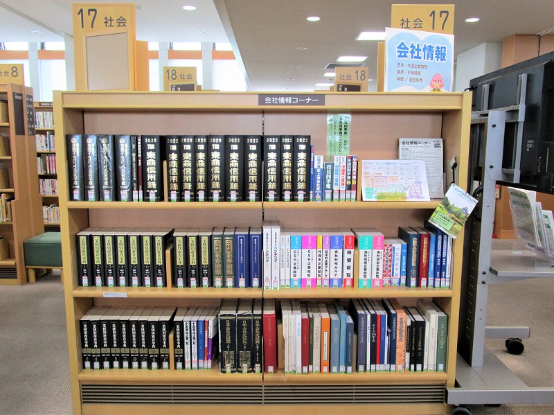 【会社情報コーナー】 社会科学カウンター横にある会社情報関連資料をまとめたコーナーです(社会17番棚)。 『東商信用録』『帝国データバンク会社年鑑』『株価総覧』『業界別審査事典』など企業・業界調査に役立つ図書や、企業発行の社史・CSRレポートなどの関連資料が置いてあります。 → 会社情報コーナーの本(2024.3更新) |