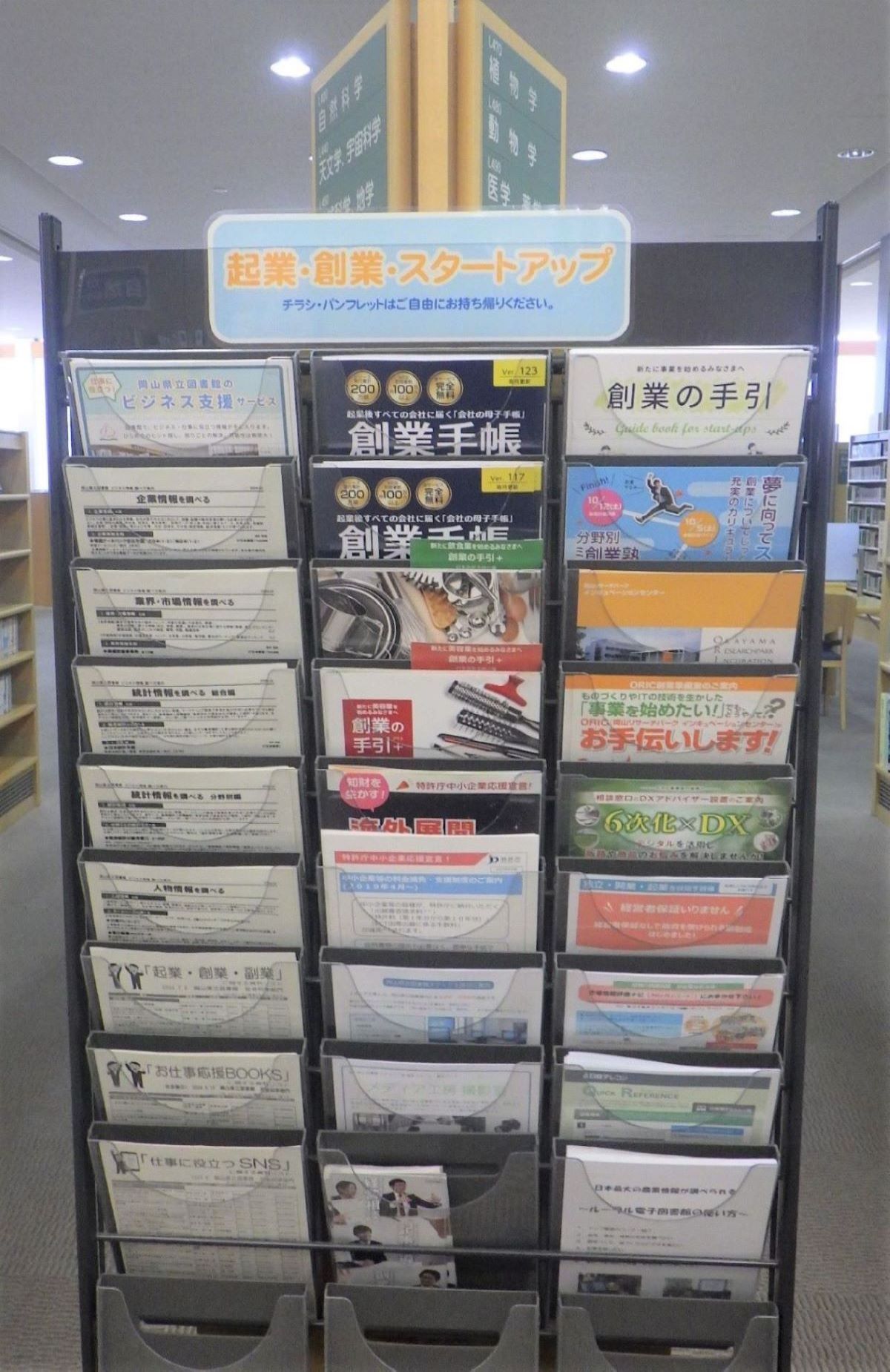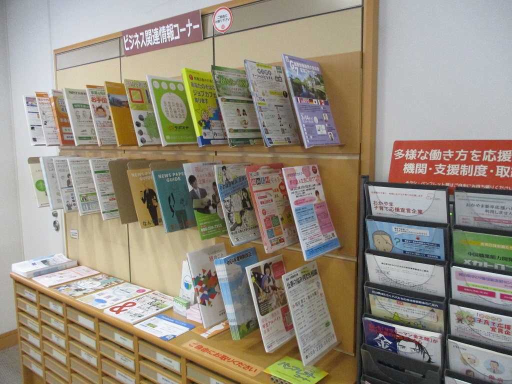 【パンフレットコーナー】 図書・雑誌以外に、県内にある施設からいただいたビジネス・仕事に関するパンフレットやチラシなどを置いています。 無料で参加できるセミナー・イベントや、相談機関の紹介など役立つ情報があるかもしれません。 ご自由にお取りいただけます。 |