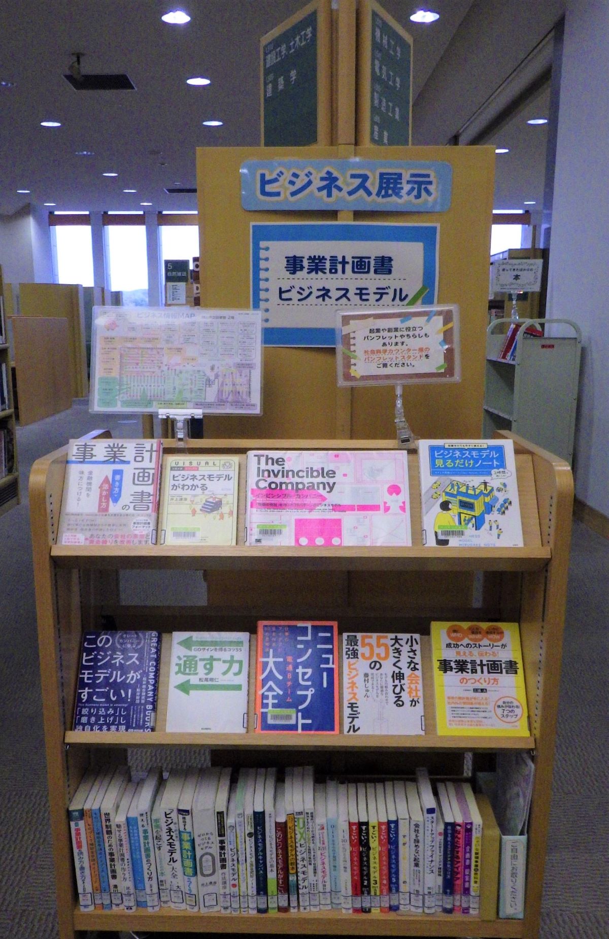 【ビジネス展示】 社会科学カウンター前で、ビジネス関連本を集めて展示しています。現在は「事業計画書・ビジネスモデル」と題して、起業に役立つ本を置いています。 あわせて、起業に関するチラシやパンフレットもまとめて設置しています。ご自由にお取りいただけます。 |